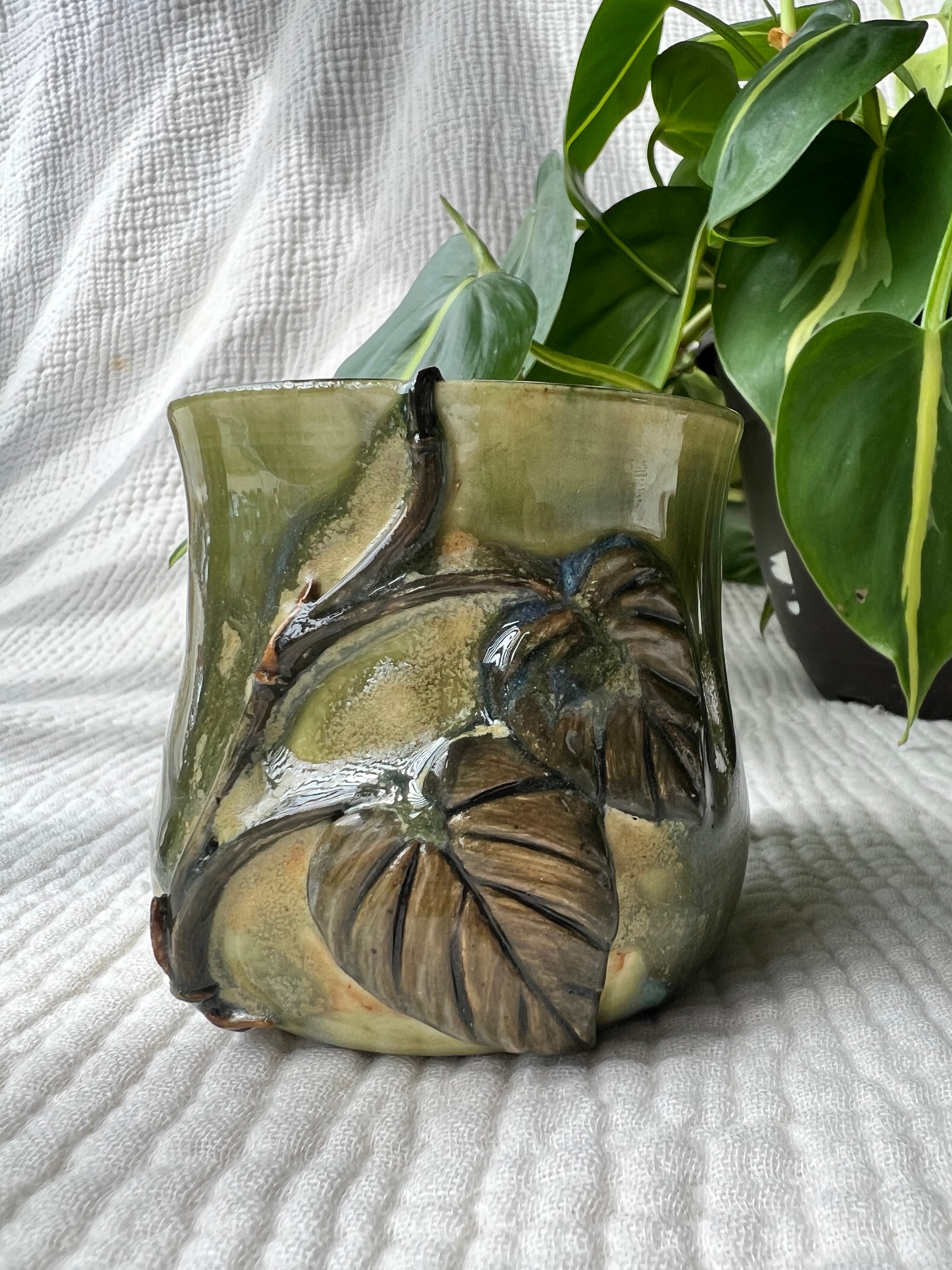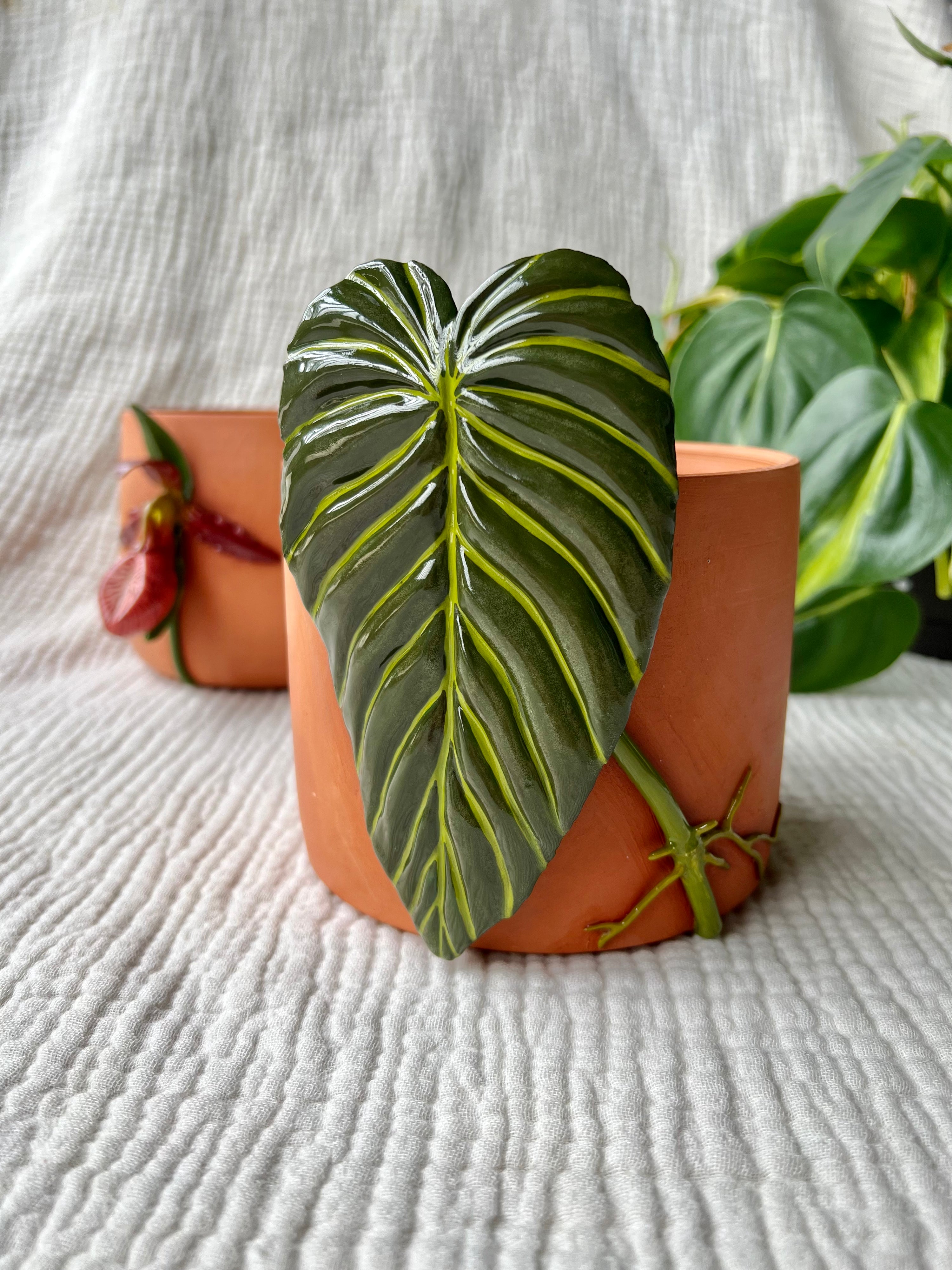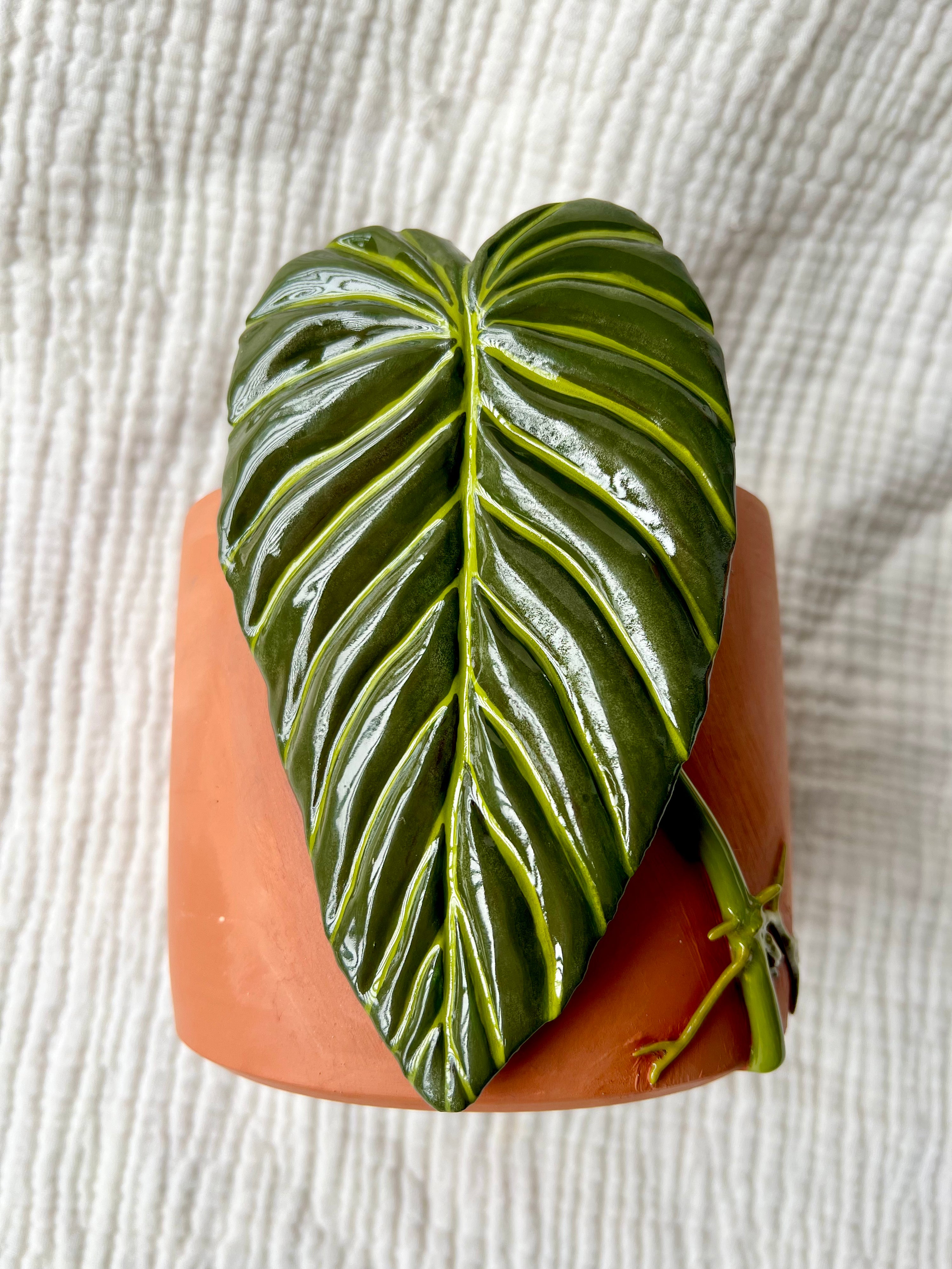 Philodendron Melanochrysum leaf, capturing its velvety texture and intricate veining in exquisite detail. As I molded the clay, I felt a deep connection to this beloved plant, its verdant leaves symbolizing resilience and growth.