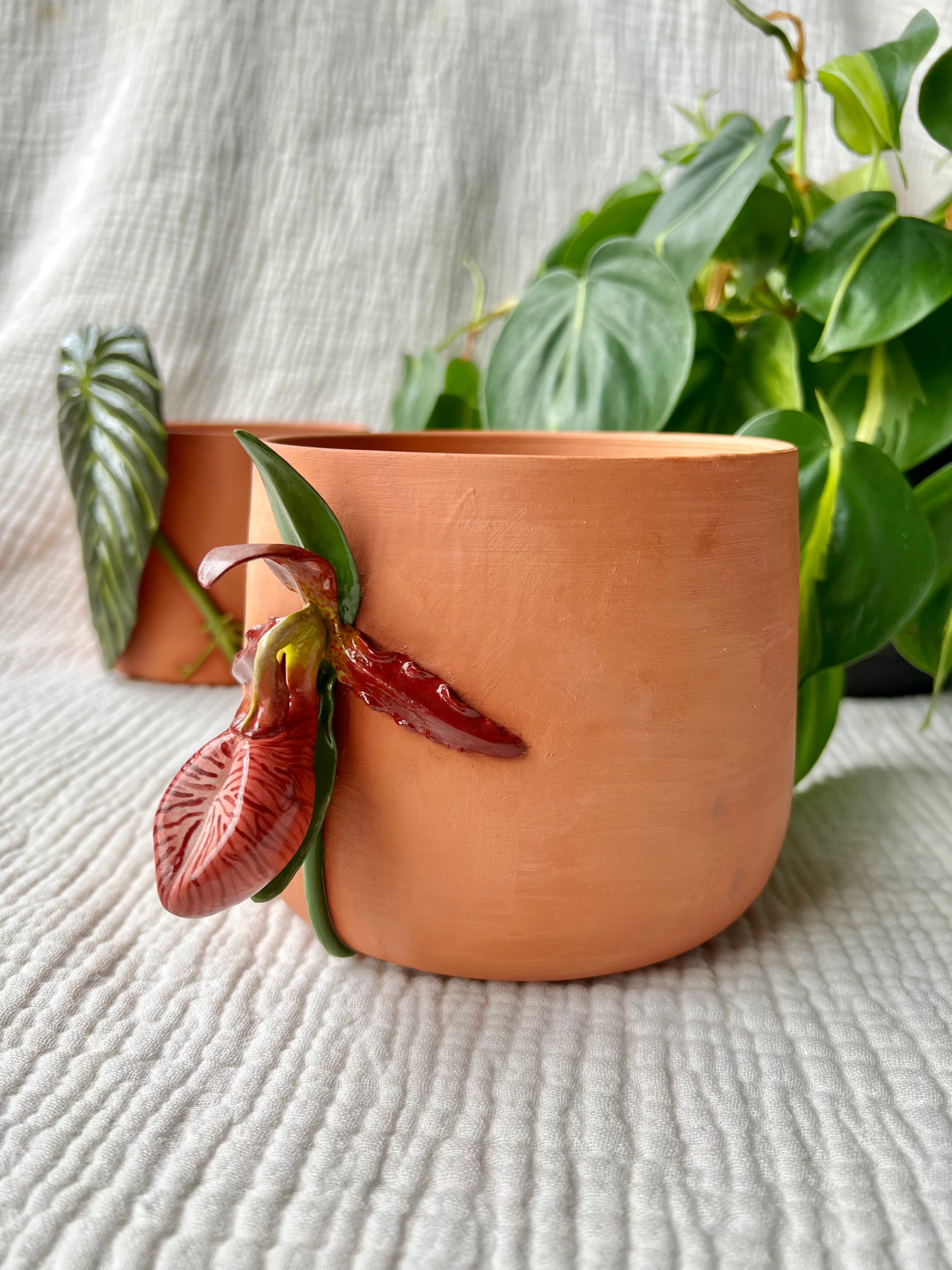 Step into my garden where the earthy warmth of terracotta meets the lush embrace of two botanical treasures close to my heart. Behold the Philodendron Melanochrysum Leaf and Lady Slipper Terracotta Plant Pots, crafted with reverence for the beauty of nature's intricate designs.